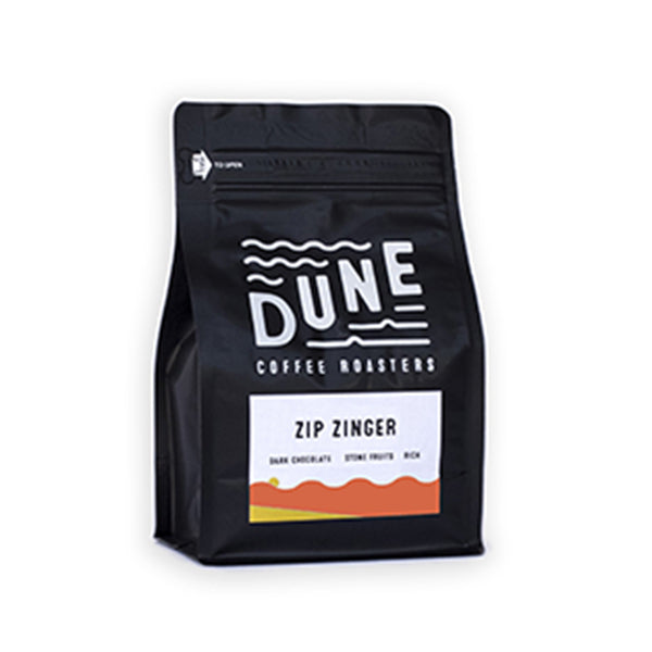If coffees are like music genres. then let’s compare Zip Zinger to the upbeat surf band vibe offering plenty of complexity and groove from the fun variety of origins featured. Whether on the water or on wheels. this blend inspires innovation with equal parts stone fruit. chocolate and caramel that swing as both espresso or brewed coffee.